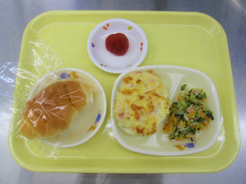 ロールパン、じゃが芋、ベーコン、バター、チーズ、牛乳、チンゲン菜、玉ねぎ、もやし、人参、いちご