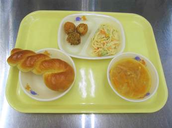 ツイストパン、スパゲッティー、すり身団子フライ、ツナ、バター、ベーコン、玉ねぎ、きゅうり、人参、コーン
